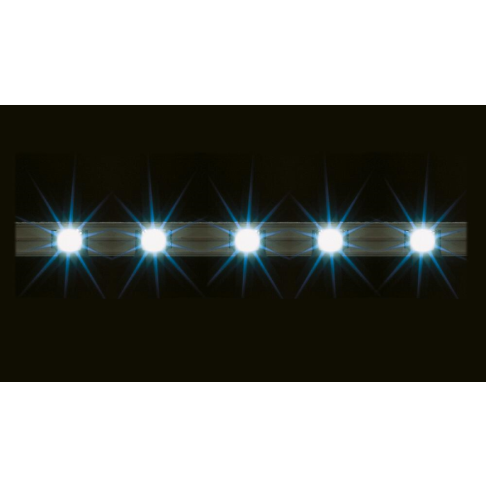 Elk voorzien van 5 leds. Kant en klaar aan te sluiten op 12-16 V, gelijk-/ wisselspanning. Aan beide zijden is er een aansluitmogelijkheid dus u kunt de strip ook in twee delen splitsen. Om bij gebruik van wisselstroom lichtflikkeringen te vermijden heeft u de gelijkrichter (Faller artikel 180633) nodig (niet inbegrepen).